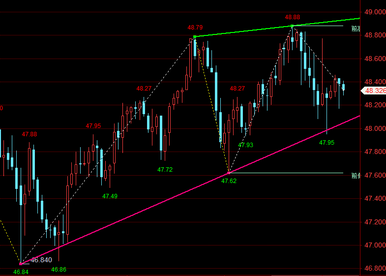 上方短期重点关注48.80-49.00一线阻力带,该区间不仅紧邻周五高点48.87,同时是前期多次测试未破的关键压力区域,若未能有效突破,大概率将制约反弹空间;下方短期支撑则聚焦47.7-47.5一线,此位置衔接当日开盘低点与前期震荡平台下沿,具备较强防守力度,若支撑失守,行情可能进一步下探。